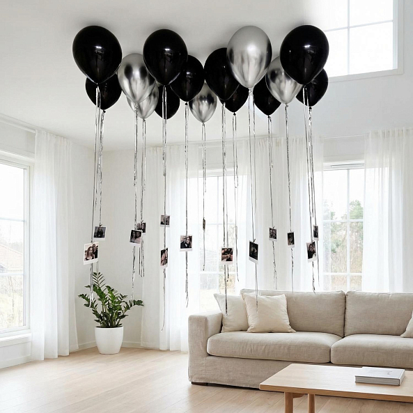 Этот уникальный набор из 15 фольговых шаров в черном и серебряном оттенках — не просто декор, а живой символ памяти и личной истории. Каждый шар, выполненный из прочного материала, дополнен вашими личными фото, прикрепленными на длинных атласных лентах или лентах дождик. Набор создает атмосферу глубоких эмоций и утонченной элегантности, идеально дополняя торжественные или памятные моменты.