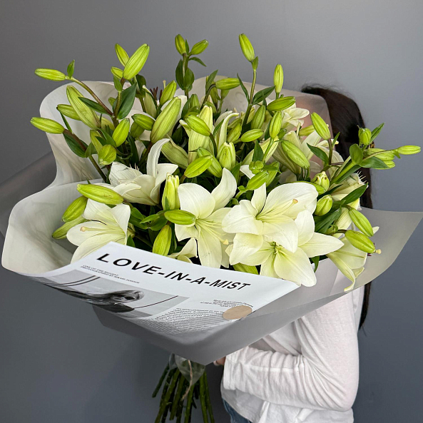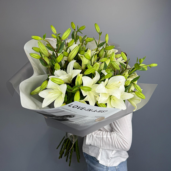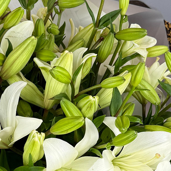 Пышный букет из свежих белых лилий — символ чистоты, благородства и искренних чувств. Каждый цветок словно только что распустился — с нежными лепестками и зелёными бутонами, обещающими долгое цветение. Идеально подходит для романтического подарка, выражения благодарности или торжественного случая.