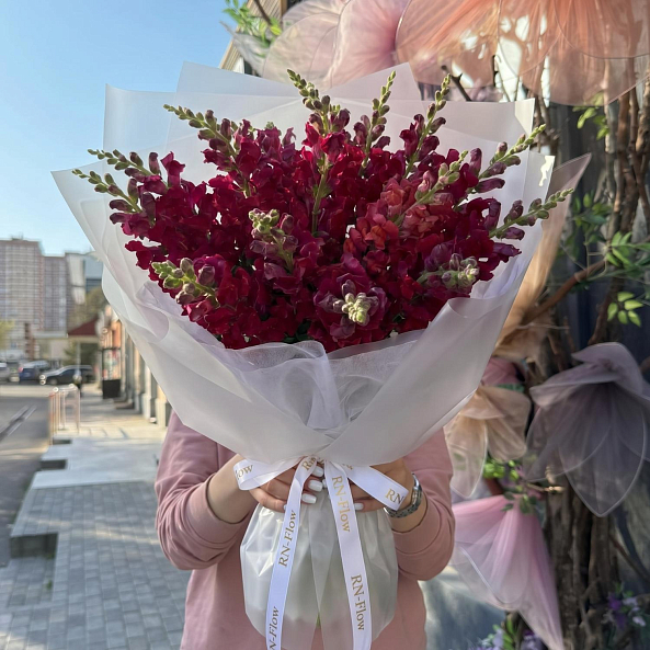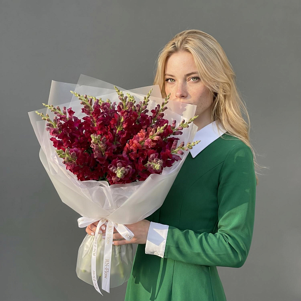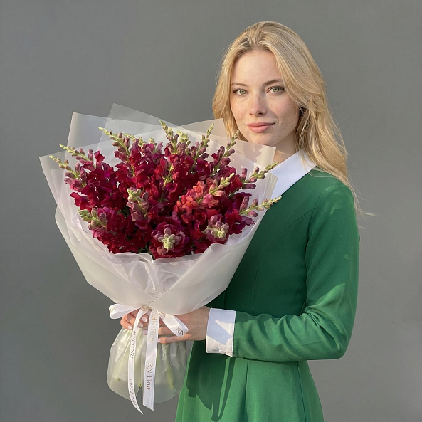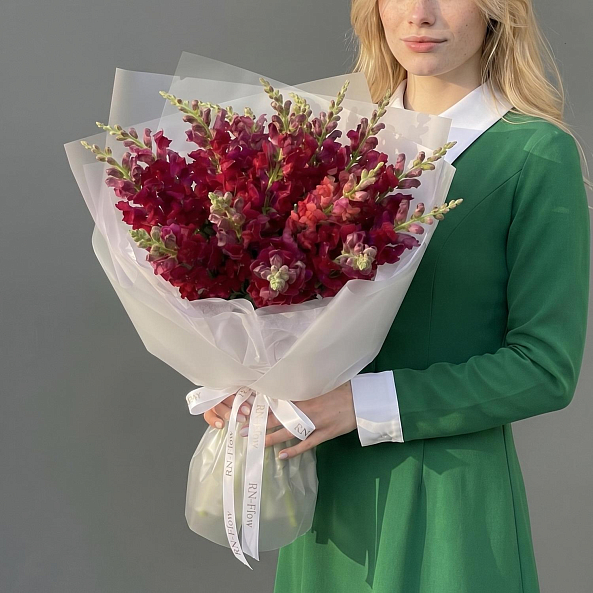Этот изысканный букет — настоящая симфония ярких эмоций и жизнелюбия, где 21 антиринум (львиный зев) в оттенках бордового, фиолетового, розового и малинового создают объемную, играющую композицию, словно застывший момент из самого радужного дня. Каждый цветок, с его миниатюрными «ротиками» и насыщенными оттенками, дарит ощущение тепла и позитива, а свежие зеленые стебли подчеркивают естественную гармонию.