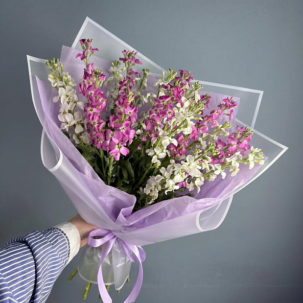 Этот изысканный букет — настоящая симфония гармонии и контраста, где 21 стебель маттиолы «Пустошка» в сочетании белых и розовых оттенков создает объемную, ароматную композицию, словно застывший момент из самого романтического уголка весеннего сада. Каждый стебель, от изящных лепестков до свежих зеленых стеблей, дарит ощущение тепла и глубины чувств, а нежный аромат, напоминающий о весенних закатах, добавляет композиции волшебства.