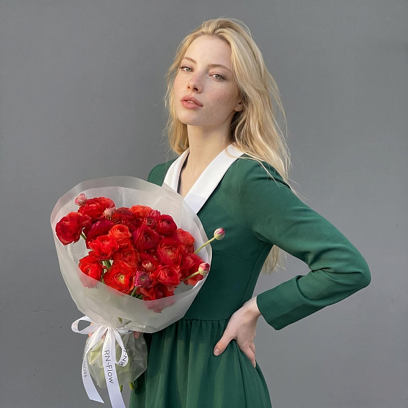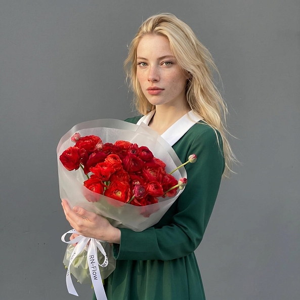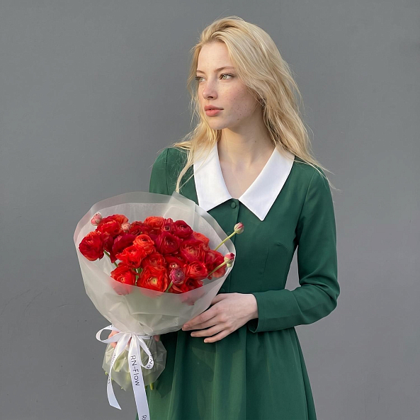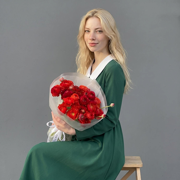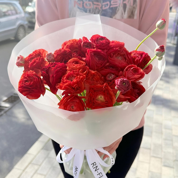 Этот изысканный букет — настоящая симфония очарования и страсти, где 21 мини-ранункулюсов (лютиков) в насыщенном багряном оттенке создают компактную, пышную композицию, словно застывший момент из самой романтической сказки. Каждый цветок, с его многослойными лепестками и бархатистой текстурой, дарит ощущение тепла и глубины чувств, а свежие зеленые стебли подчеркивают естественную гармонию.
