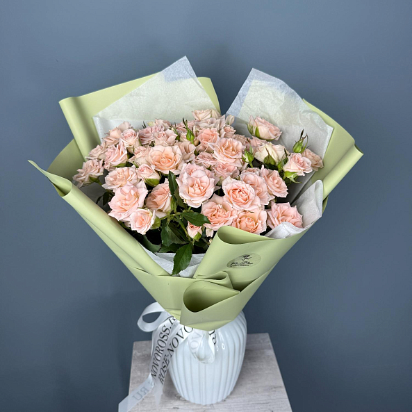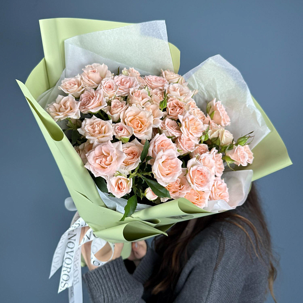 Нежно-кремовые бутоны с лёгким персиковым оттенком раскрывают свою прелесть постепенно, радуя свежестью и объёмом. Идеальный подарок на любой праздник.