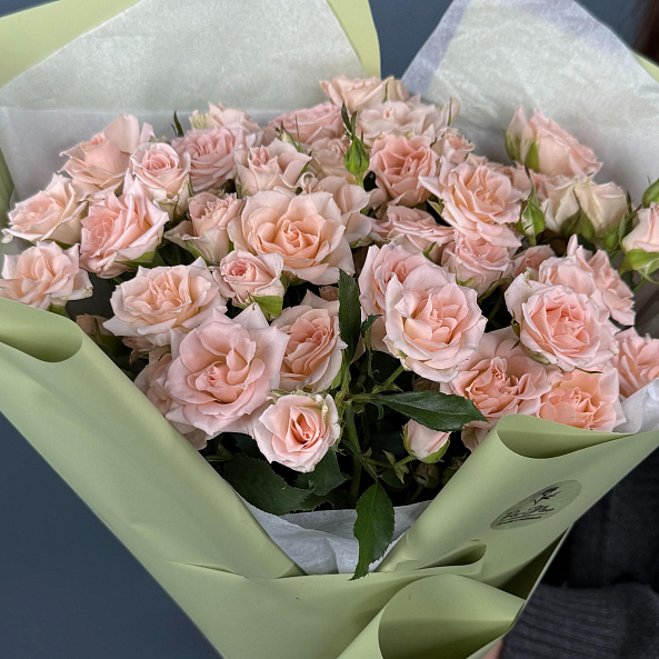 Изящный букет из 21 кустовой розы сорта "Свит Сара" — это гимн женственности и утончённого вкуса.