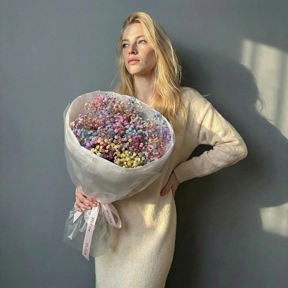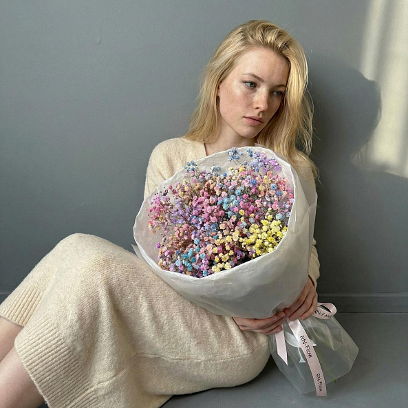 Погрузитесь в мир ярких эмоций с этим уникальным букетом из 5 радужных гипсофил, где каждый цветок словно застыл в моменте радуги. Нежные соцветия, окрашенные в пастельные оттенки розового, голубого, желтого и фиолетового, создают впечатление, будто вы держите в руках кусочек волшебства. Элегантная упаковка в белую бумагу с розовой лентой подчеркивает изысканность композиции, превращая её в готовый подарок, который запомнится надолго.