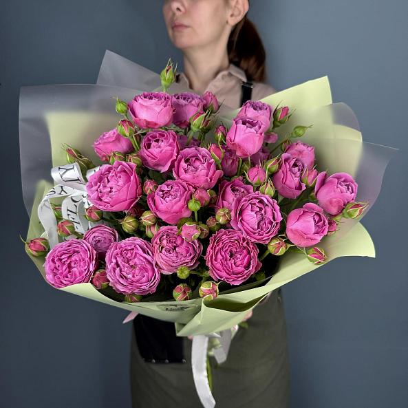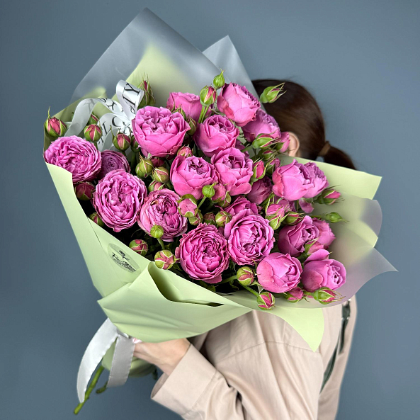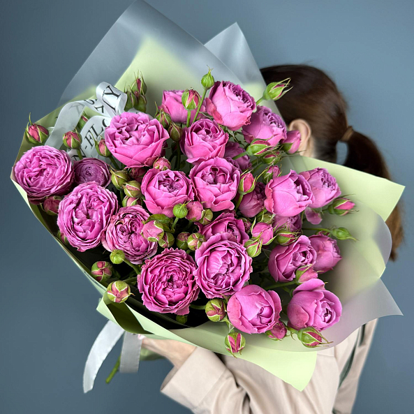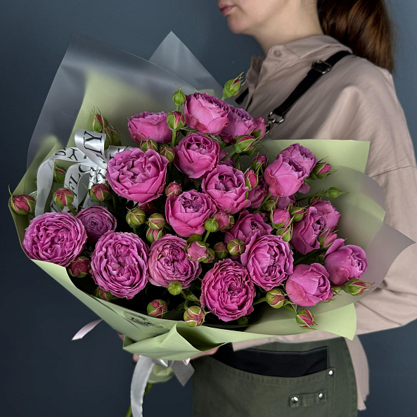 Насыщенный, пышный букет из пяти роз глубокого фиолетово-розового оттенка. Многослойные бутоны, нежная текстура и яркий цвет создают ощущение роскоши и романтики. Идеален для особенного момента: первого свидания, дня рождения или просто чтобы сказать: «Ты — моя любимая».