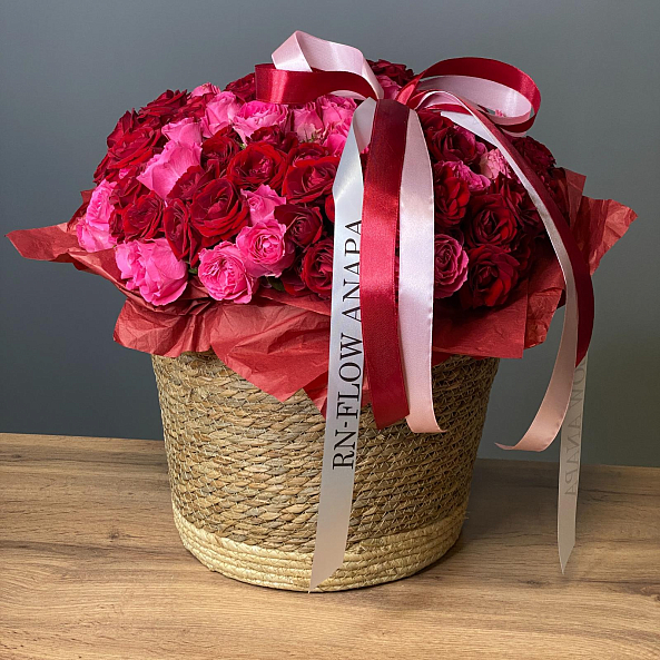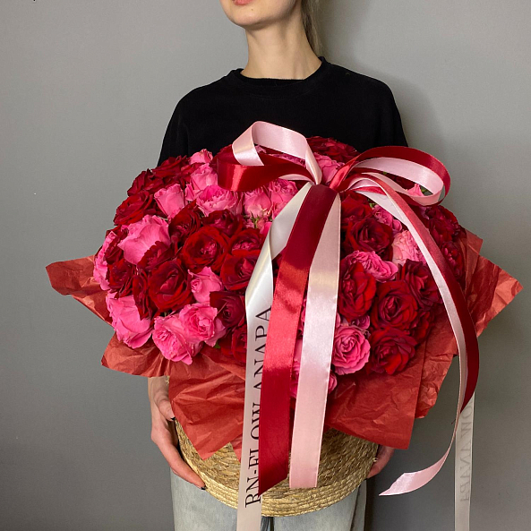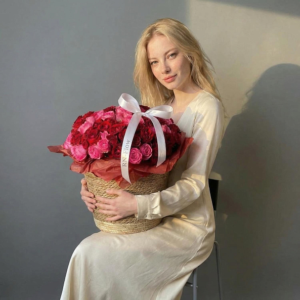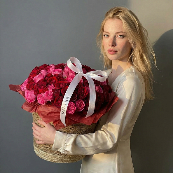 Розы аккуратно расположены в специальном аквавазе, который не только сохраняет их свежесть, но и позволяет с легкостью извлечь букет в любой момент, не нарушая композиции. Изящная корзина, выполненная в стиле современного минимализма, становится частью вашего пространства: после завершения цветения она легко преобразуется в элегантный элемент интерьера или практичный аксессуар для хранения. Ее мягкие линии и утонченный дизайн подчеркнут уют гостиной, спальни или кухни, а функциональность превратит ее в верного помощника в быту.