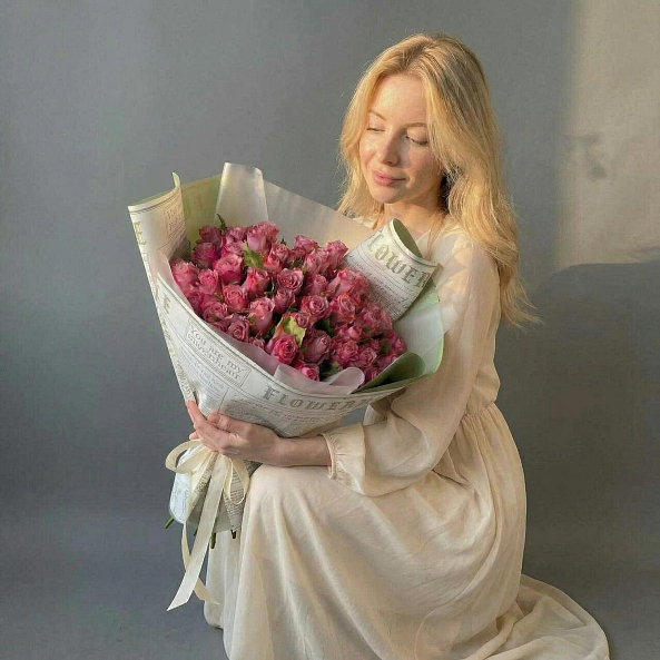 Этот изысканный одиночный цветок — настоящий символ чистоты и глубины чувств, словно застывший волшебный момент из сказки. Розовая роза в идеальной форме с насыщенным оттенком и свежими зелеными листьями дарит ощущение тепла и уюта, а компактная высота 40 см создает изящную композицию, которая завораживает своей простотой и элегантностью.