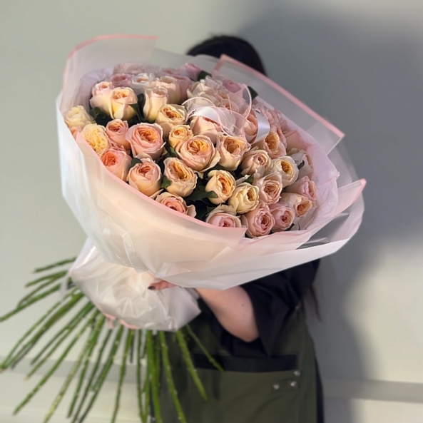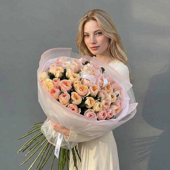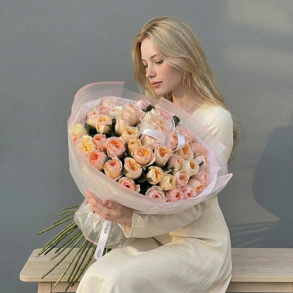 Этот изысканный букет — настоящая симфония нежности и эности, где розы «Джульета» пионовидной формы в оттенках персиково-розового создают объемную и гармоничную композицию. Каждый бутон, от пышных многослойных лепестков до свежих зеленых стеблей, словно застывший волшебный рассвет в пастельных тонах.