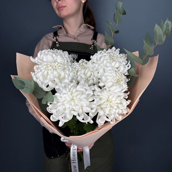 Пышные белые хризантемы и свежий эвкалипт — это не просто букет, а целая атмосфера. Идеален для тех, кто ценит простоту, доброту и гармонию.