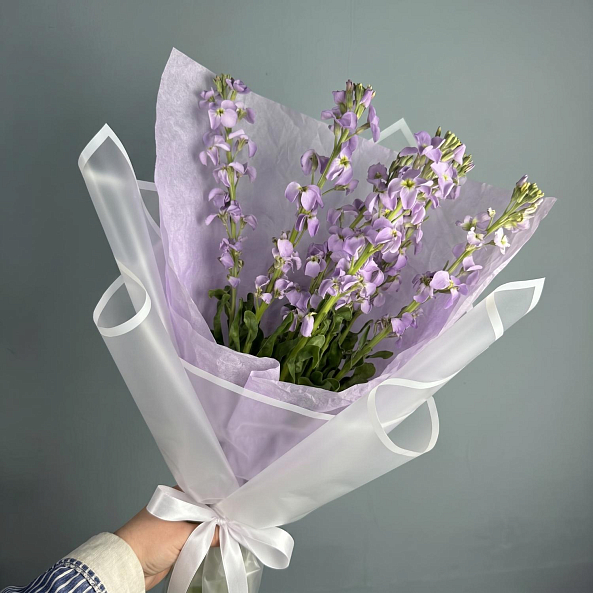 Этот изысканный букет — настоящая симфония гармонии и умиротворения, где 7 стеблей маттиолы «Пустошка Лаванда» в нежно-лавандовом оттенке создают объемную, ароматную композицию, словно застывший момент из самого спокойного уголка весеннего сада. Каждый стебель, от изящных лепестков до свежих зеленых стеблей, дарит ощущение тепла и глубины чувств, а нежный аромат, напоминающий о закатных ветрах, добавляет композиции магии.