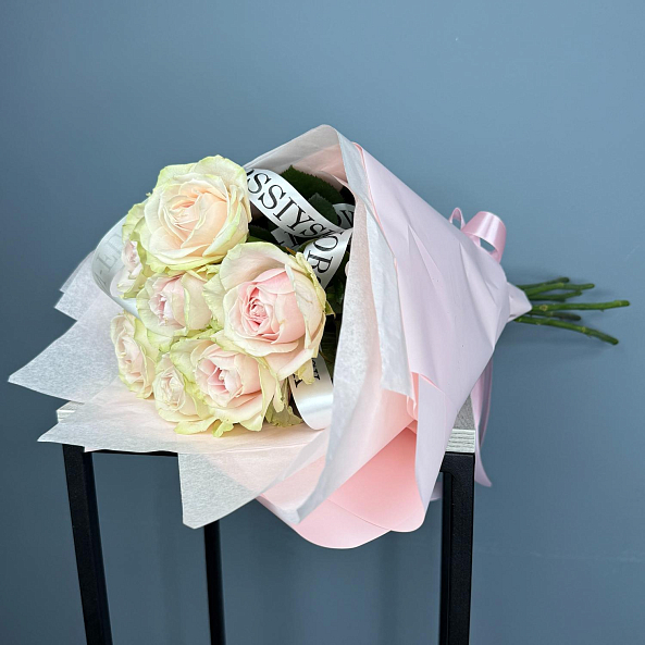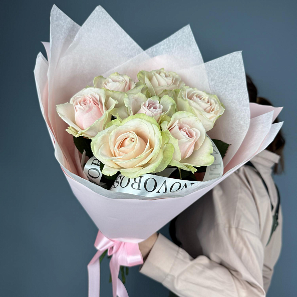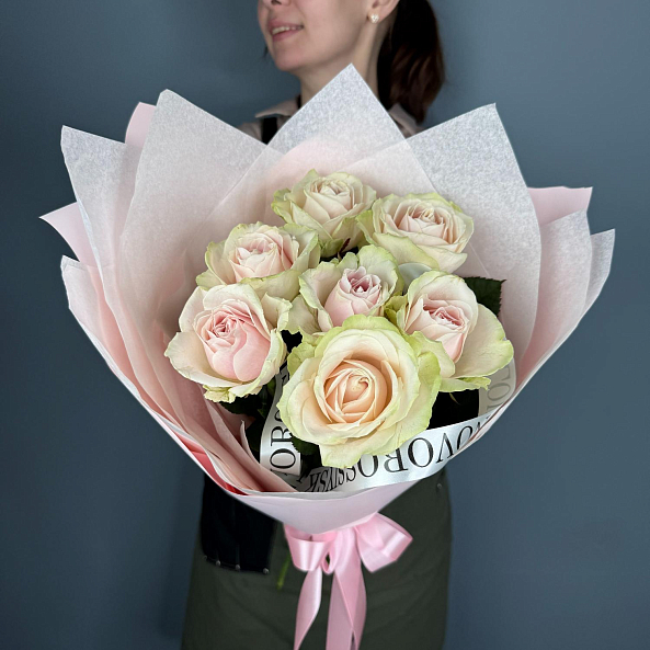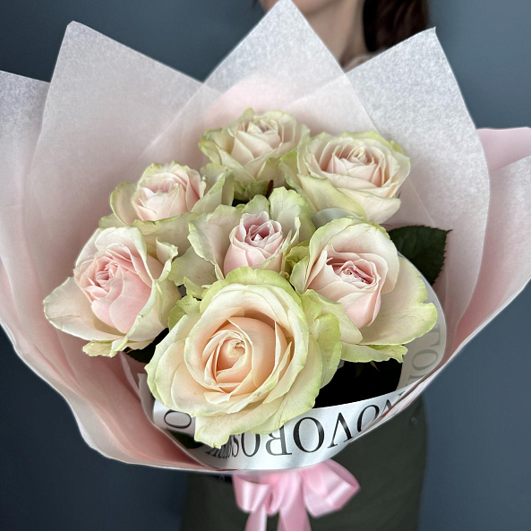 Нежный и утонченный букет из 7 роз «Свит Аваланж» (Грейси). Каждый бутон — это пастельное сочетание кремового, персикового и легкого зеленоватого оттенка на краях лепестков, создавая ощущение свежести и нежности. Композиция собрана в компактную, изящную форму и упакована в матовую бумагу с лентой — идеальный выбор для тех, кто ценит минимализм, элегантность и деликатность. Символ искреннего внимания и теплых чувств.