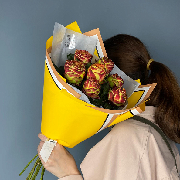 Яркая роза 40 см с пылающими оттенками оранжевого, красного и желтого — настоящий огонь страсти в одном бутоне. Идеальный выбор для тех, кто хочет подарить нечто запоминающееся и яркое.