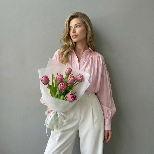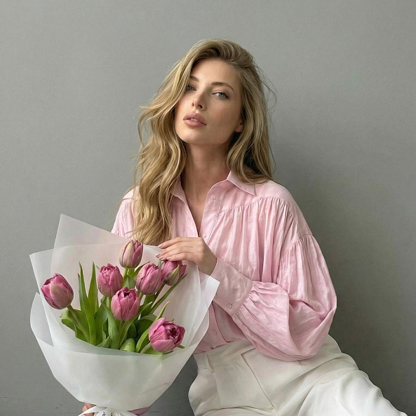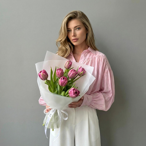 Этот изысканный букет из 7 розовых тюльпанов — воплощение нежности и романтики, словно застывший волшебный рассвет. Каждый лепесток, с его плавным переходом от нежно-розового к фиолетовому, дарит ощущение тепла и уюта, а гладкая текстура подчеркивает изысканность и современный стиль. Плотно собранные в компактную композицию, тюльпаны создают образ минималистичной роскоши, который завораживает своей простотой и элегантностью. Упакованный в прозрачную кальку с атласной лентой «RN-Flow», букет выглядит лаконично и стильно, идеально дополняя как повседневный образ, так и особый момент.