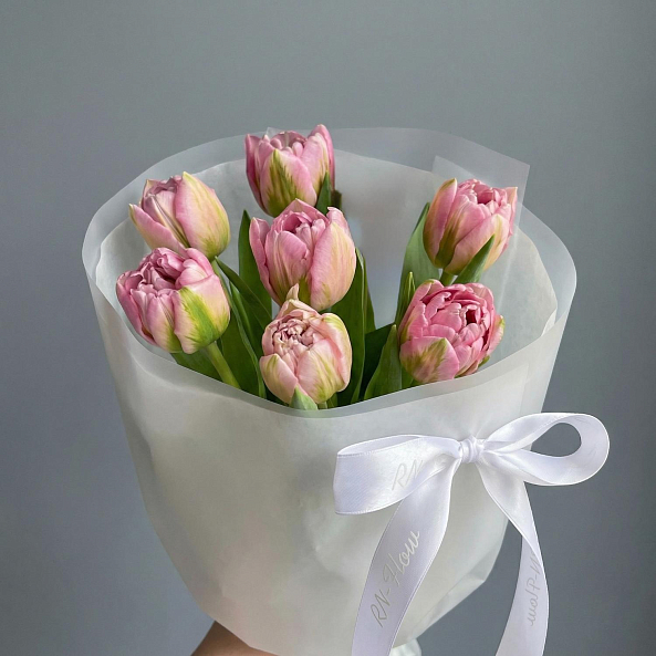 Этот изысканный букет из 7 нежно-розовых пионовидных тюльпанов — словно застывшая мечта, где каждый лепесток, с его пышной текстурой и мягким розовым оттенком дит ощущение уюта и романтики. Пионовидные бутоны, словно маленькие облака, создают объемную композицию, напоминающую весенний сад в самом расцвете. Аккуратные зеленые стебли придают букету естественную гармонию, а упаковка в белую кальку с лентой «RN-Flow» подчеркивает его лаконичный и современный стиль.