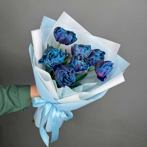 Этот изысканный букет из крашенных тюльпанов — настоящая живопись, где синие и фиолетовые оттенки переплетаются в динамичный микс, словно застывшие волны океана. Каждый лепесток, окрашенный вручную в глубокие морские тона, дарит ощущение таинственности и изысканной роскоши, а аккуратные зеленые стебли придают композиции естественную гармонию. Упакованный в прозрачную кальку с атласной лентой «RN-Flow», букет выглядит как произведение искусства — идеально дополняя как современный интерьер, так и необычный подарок.