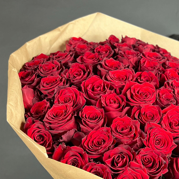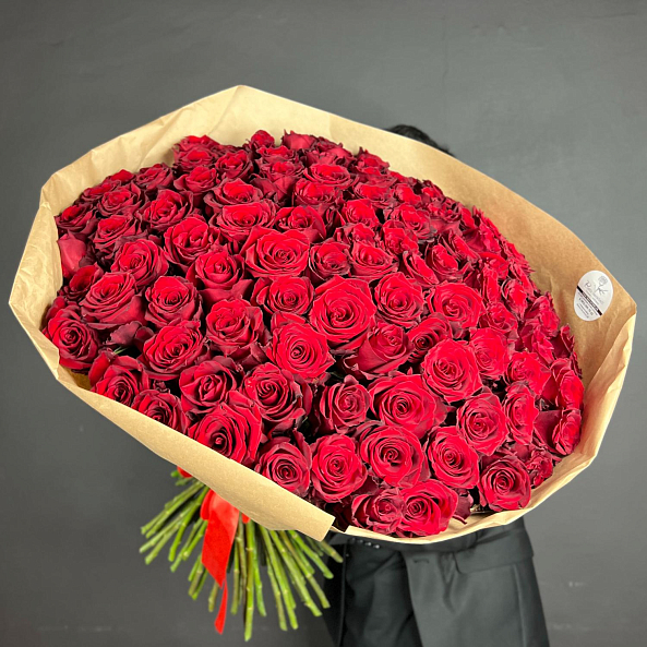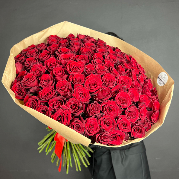 Монументальный и роскошный букет из 101 премиум-роз высотой 70 см. Глубокий, насыщенный красный цвет каждого бутона создает ощущение страсти, силы и вечной любви. Розы собраны в идеально округлую, объемную форму — это не просто букет, а настоящее произведение искусства. Упакован в простую крафт-бумагу с яркой лентой — символ максимального внимания, восхищения и глубоких чувств. Идеальный выбор для самого важного момента — свадьбы, годовщины или признания в любви.