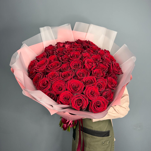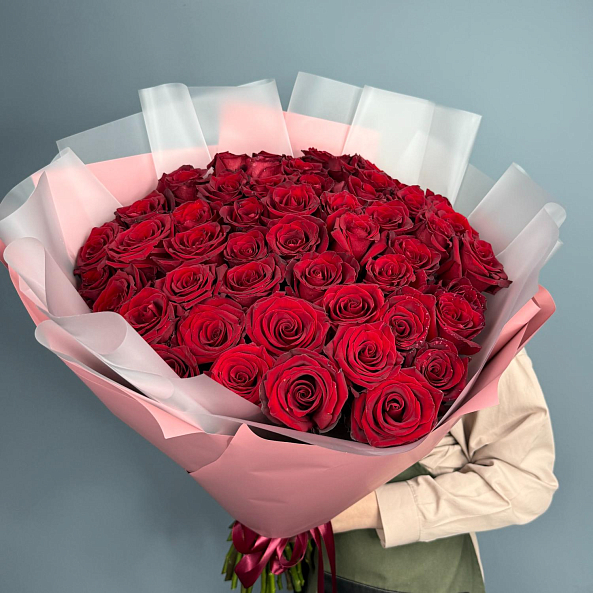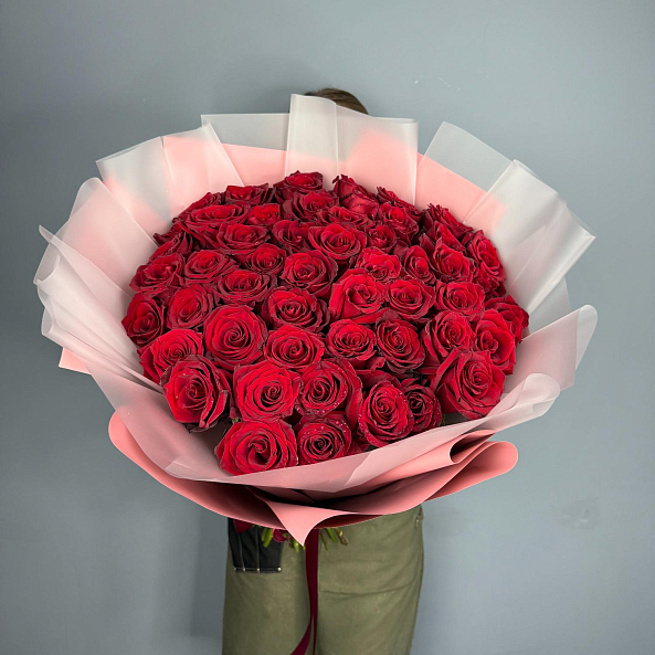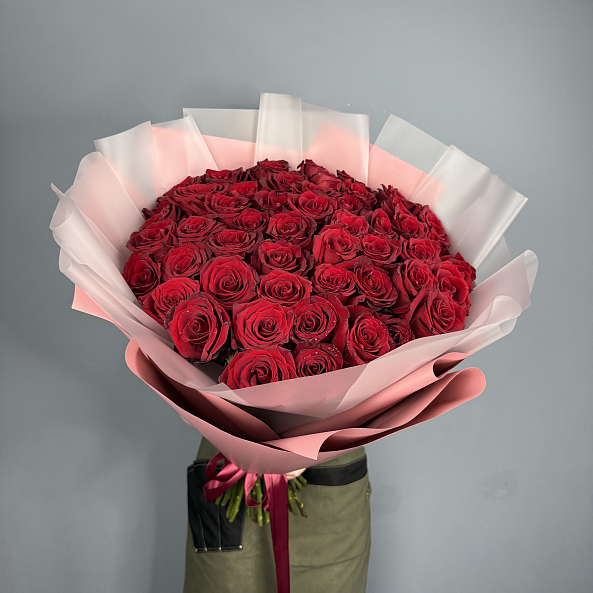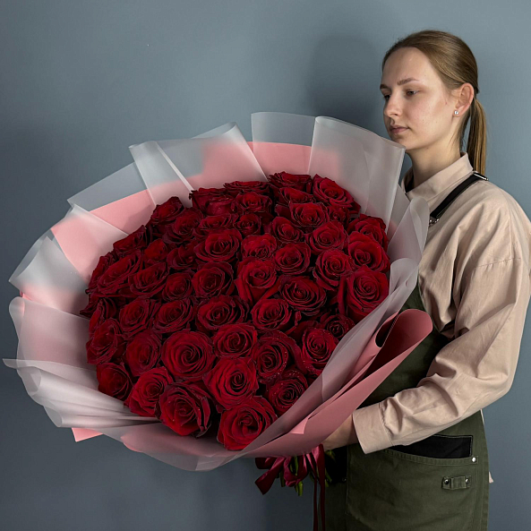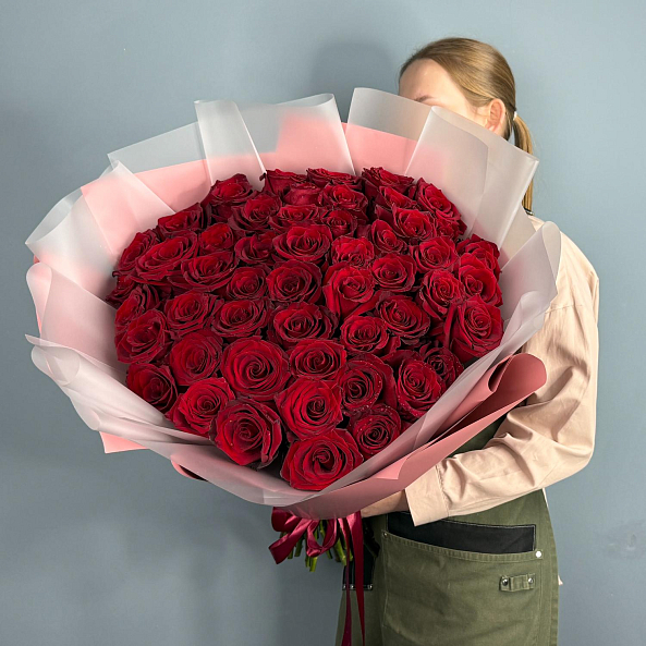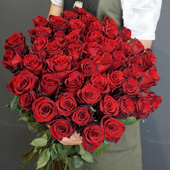 Букет из 51 эквадорской розы сорта Эксплорер — выбор тех, кто ценит качество и роскошь. Цветы высотой около 70 см, в насыщенном бордовом оттенке, выглядят особенно торжественно и благородно. Этот букет подойдет для романтических подарков, юбилеев, свиданий и других значимых событий.