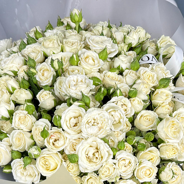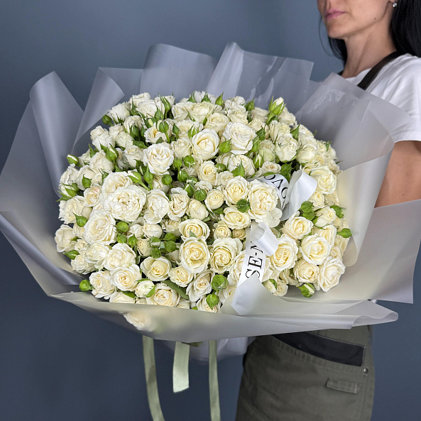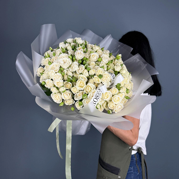 Элегантный и изысканный букет из 51 кустовой розы сорта «Беларусь» — символ чистоты, гармонии и безупречного вкуса. Белоснежные цветы с мелкими и средними бутонами, расположенными на одном стебле, создают пышную, воздушную композицию, напоминающую цветущее облако.