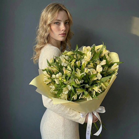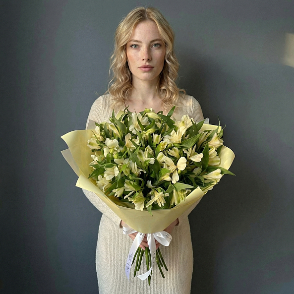 Погрузитесь в атмосферу утонченной простоты с этим изысканным букетом из 11 белых альстромерий, чьи нежные лепестки, словно снежные хлопья, излучают чистоту и искренность. Каждый цветок, с его изысканной формой и легким зеленоватым оттенком в центре, создает ощущение свежести и естественной гармонии, а аккуратная упаковка в светло-желтую бумагу с белой лентой подчеркивает элегантность композиции.