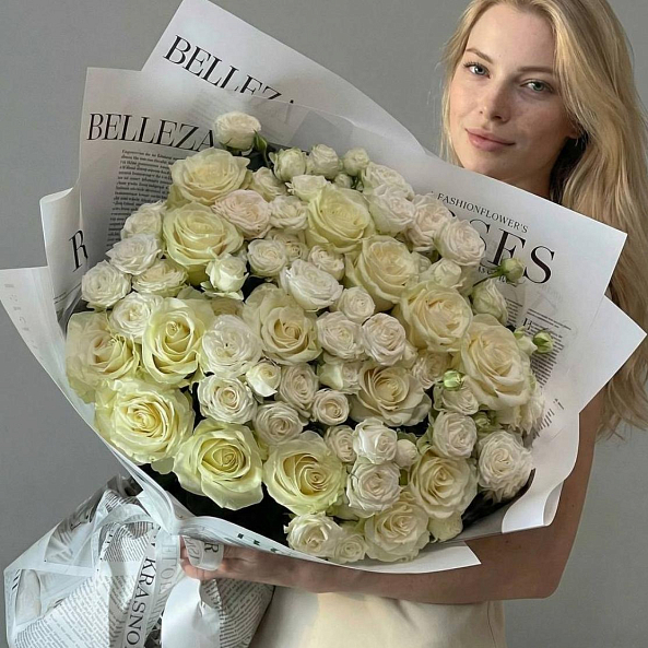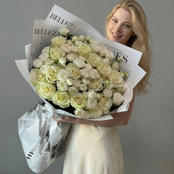Букет Гигант. Кустовая Пионовидная Белая Роза "Вайт Пиони", Роза Эквадор Премиум "Мондиаль"
