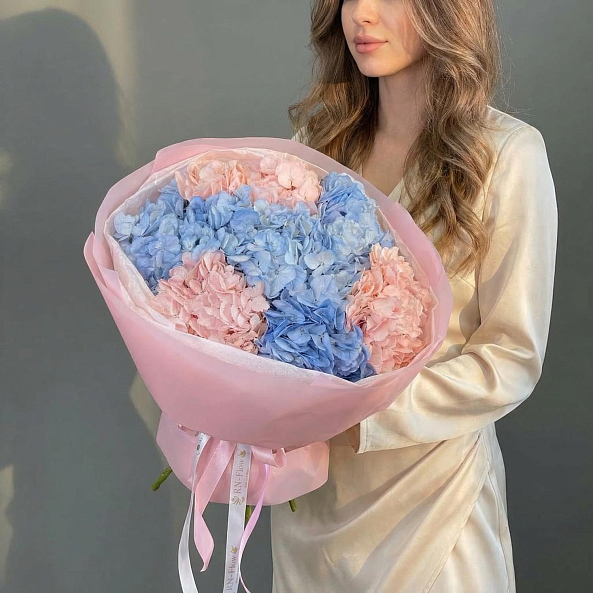 Этот изысканный букет из 7 гортензий — нежное слияние голубых и нежно-розовых соцветий, словно застывший волшебный закат над океаном. Каждое соцветие, с его объемной текстурой и плавным переходом от прохладного голубого к теплому розовому, дарит ощущение спокойствия и романтики, а аккуратные зеленые стебли придают композиции естественную гармонию. Упакованный в розовую кальку с атласной лентой «RN-Flow», букет выглядит лаконично и стильно, идеально дополняя как повседневный образ, так и особый момент.
