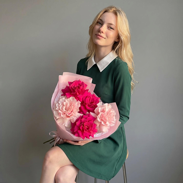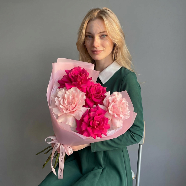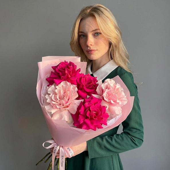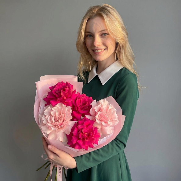 Букет «Розовый Дуэт: 5 Французских Роз «Пинк Мондиаль» и «Фулл Монти» 70 см»