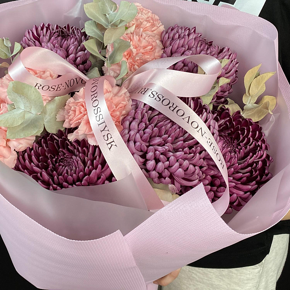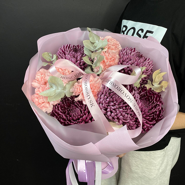 Букет из фиолетовых хризантем "Бигуди" и диантусов