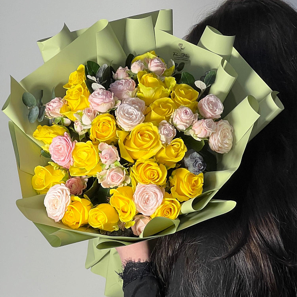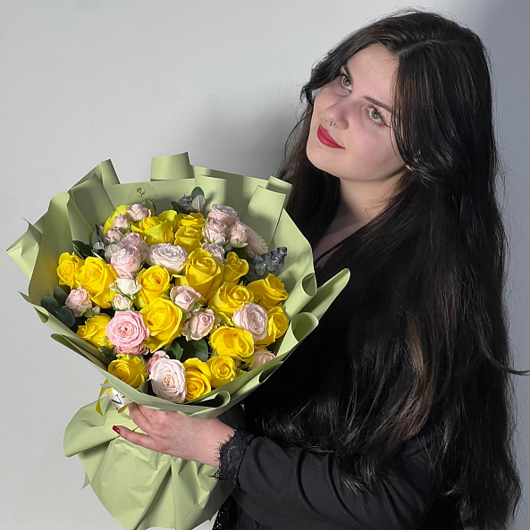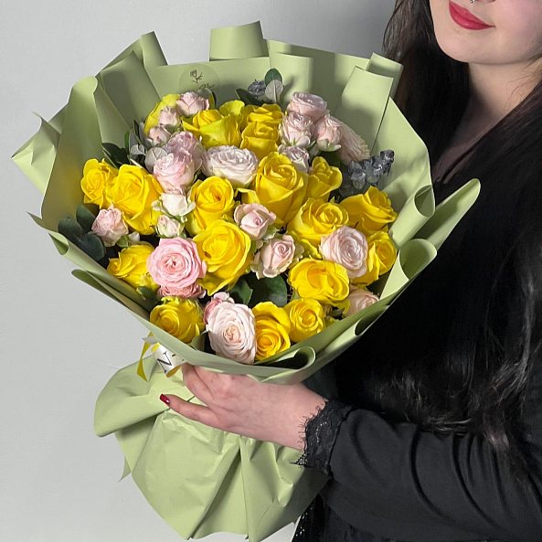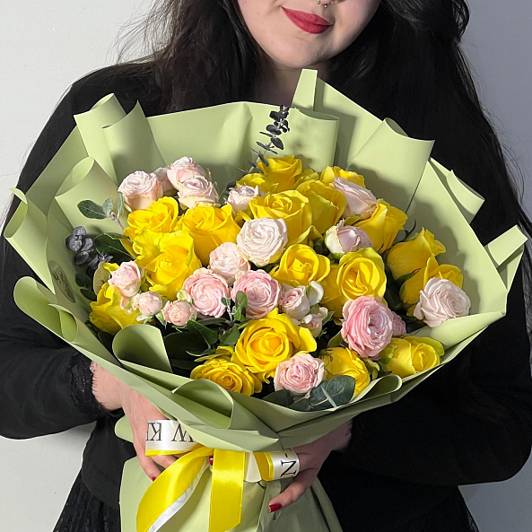Солнечный букет из ярких желтых и нежных розовых роз — воплощение радости, тепла и позитива. Свежая зелень и элегантная упаковка создают идеальный подарок для поднятия настроения или празднования светлого события.