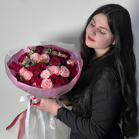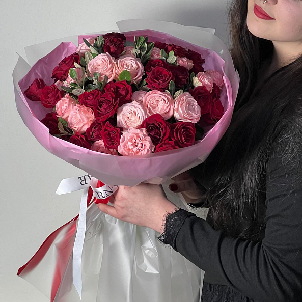 Роскошный букет из насыщенных бордовых и нежных розовых роз — символ глубокой страсти и романтики. Идеальный выбор для Дня Святого Валентина, годовщины или любого особенного момента, чтобы выразить самые сильные чувства.