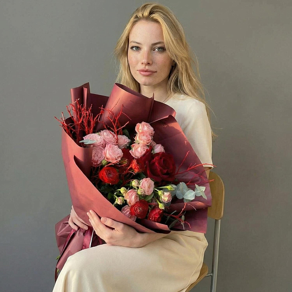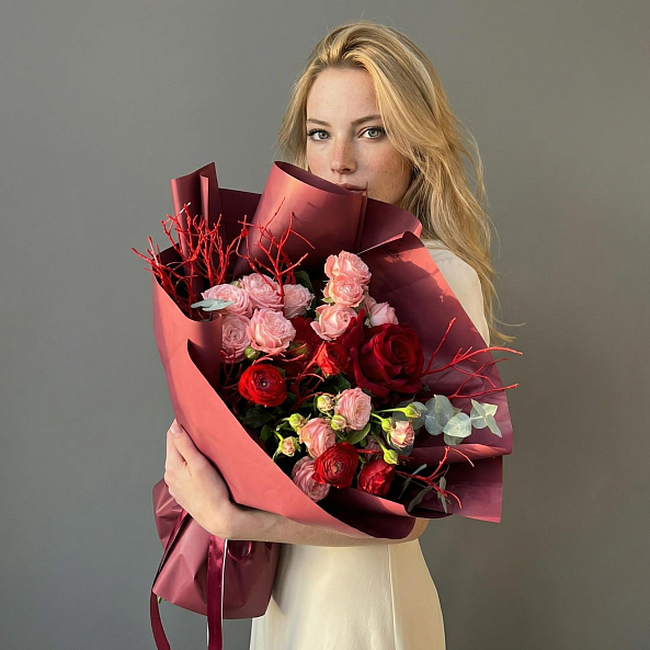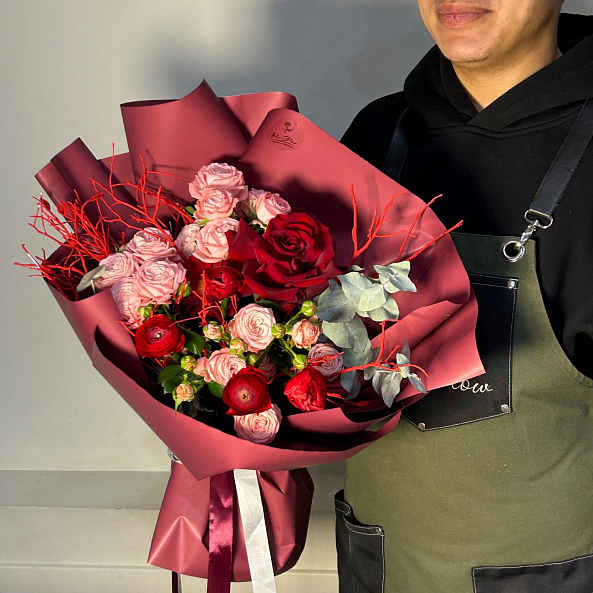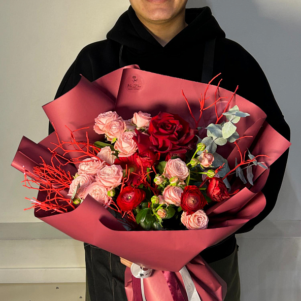 тот изысканный букет — огненное переплетение насыщенных красных роз и нежных розовых оттенков, словно горящее пламя, окутанное розовой дымкой. Каждый бутон, от бархатистых лепестков красных роз до пышных соцветий розовых ранункулюсов и гвоздик, дарит ощущение глубины и страсти, а аккуратные ветки эвкалипта и красные декоративные прутья придают композиции динамику и естественную гармонию. Упакованный в бордовую и розовую кальку с атласной лентой «RN-Flow», букет выглядит как произведение искусства — идеально дополняя романтический образ или торжественное мероприятие.
