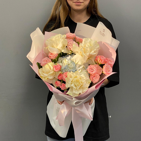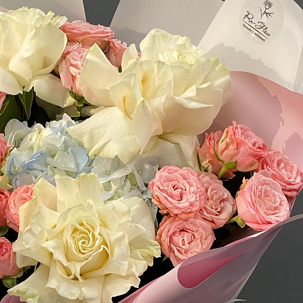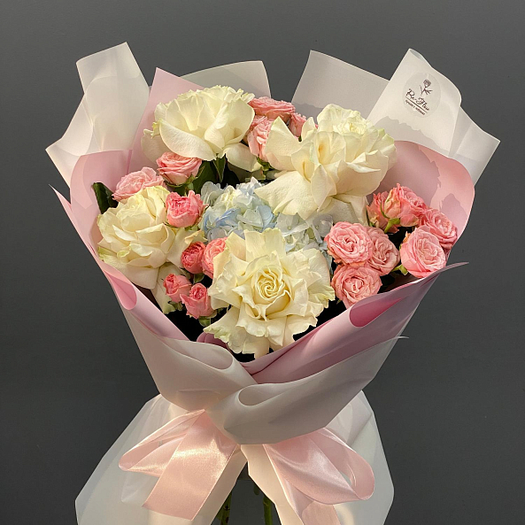 Букет цветов — французская роза "Мондиаль" белая, кустовая пионовидная роза "Мадам Бомбастик", голубая гортензия — это сочетание элегантности, нежности и изысканности. Белые розы придают букету чистоту и благородство, пионовидные бутоны добавляют объём и романтику, а голубая гортензия создаёт воздушную и свежую композицию. Идеальный выбор для торжественных событий, поздравлений или как символ любви и уважения.