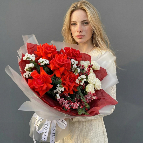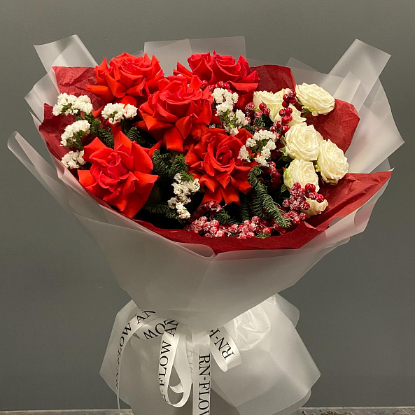Букет цветов. Французская Роза "Нина", Кустовая Пионовидная Роза "Вайт Пиони", Статица Белая, Нобилис.