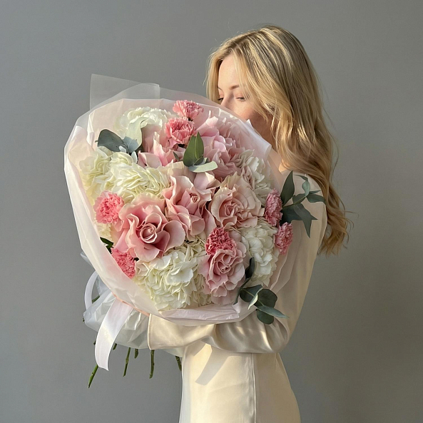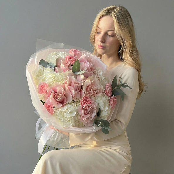 Персиково-розовые розы, белая гортензия и розовые гвоздики — это не просто букет, а целая история. Идеален для тех, кто хочет подарить не просто цветы, а целое настроение.