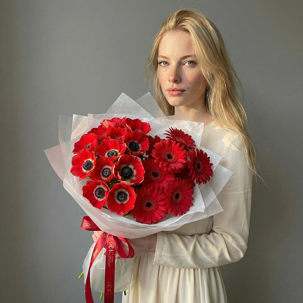 Букет «Красный бал» — это смелое и страстное выражение чувств в каждом лепестке. Яркие красные анемоны с глубокими темными центрами, словно живые искры, гармонично соседствуют с пышными герберами, дарящими объем и энергичность. Белая упаковка подчеркивает насыщенность цветов, а бордовая лента с надписью «RN-Flow» добавляет изысканности и завершённости. Этот букет — идеальный выбор для тех, кто хочет выразить глубокую любовь, признание в чувствах или просто подарить вдохновение. Подойдет для Дня святого Валентина, годовщины или как смелый жест, чтобы напомнить близкому человеку о вашей страсти и преданности. Каждый цветок здесь — не просто подарок, а искреннее послание, которое останется в памяти как яркий след эмоций.
