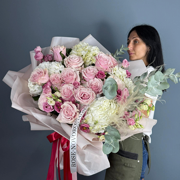 Букет цветов. Гортензия Белая, Роза Нежно-Розовая "Пинк Мондиаль", Эустома Розовая, Эвкалипт, Сухоцвет "Ковыль".