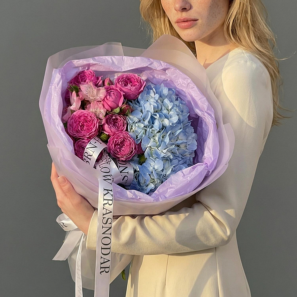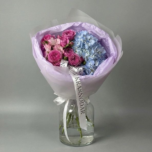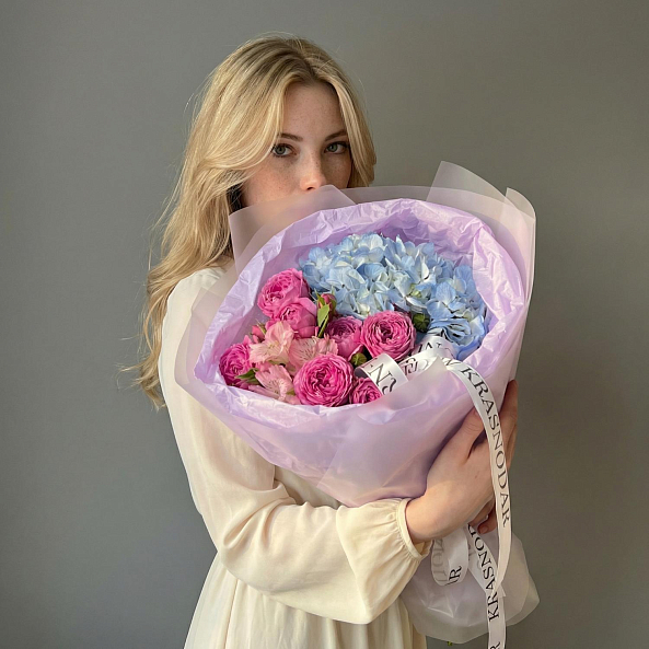 Голубая гортензия, розовая альстромерия и пушистые пионовидные розы «Мисти Баблс» — это не просто букет, а целая история. Идеален для тех, кто хочет подарить не просто цветы, а целое настроение.