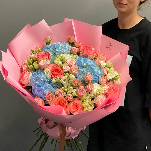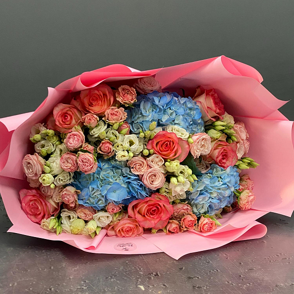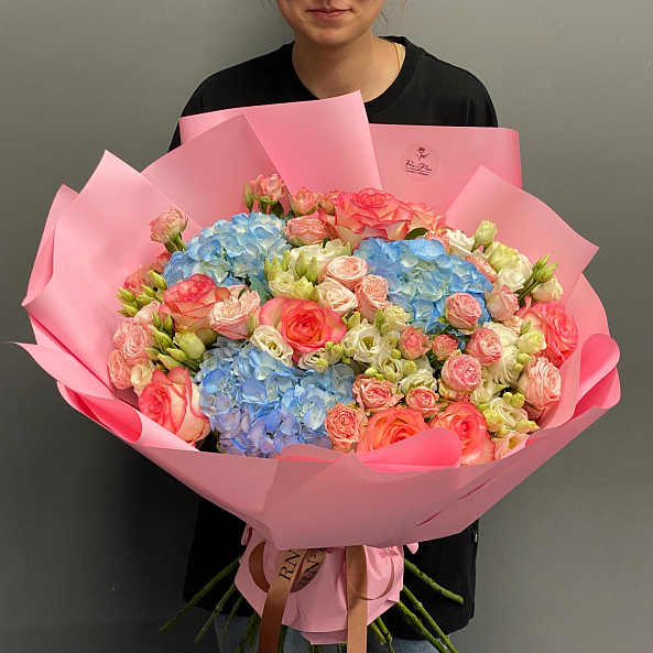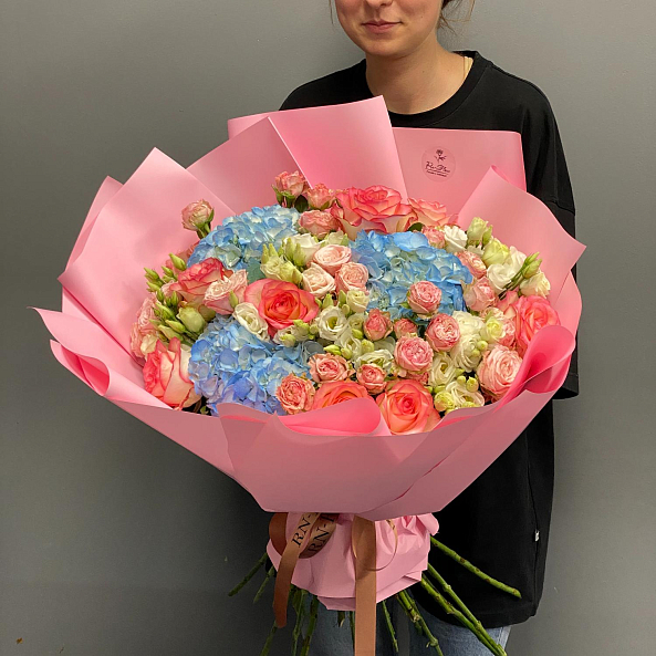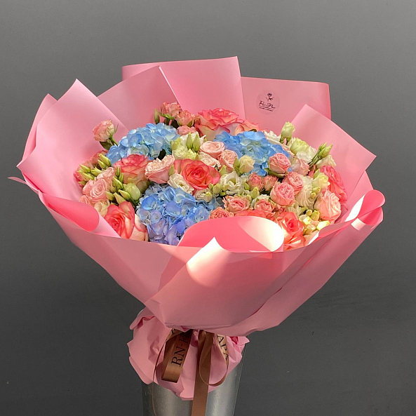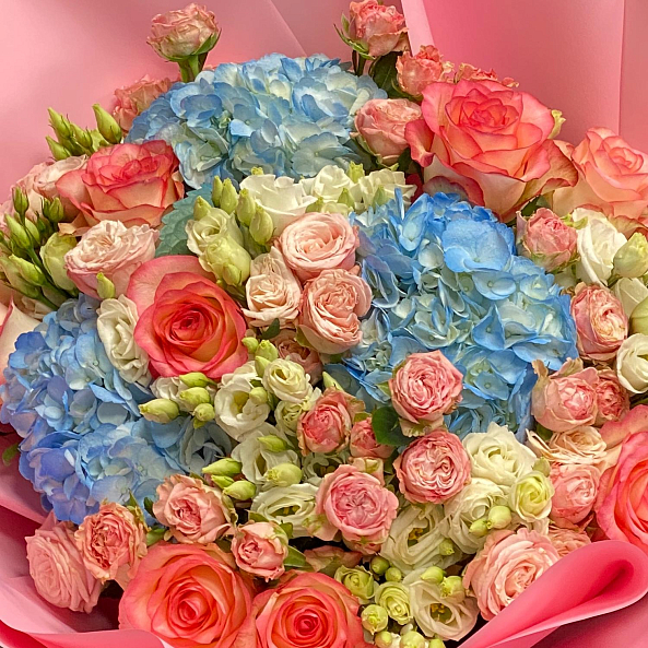 Гортензия голубая, эустома белая, роза «Джумилия», кустовая пионовидная роза «Мадам Бомбастик»