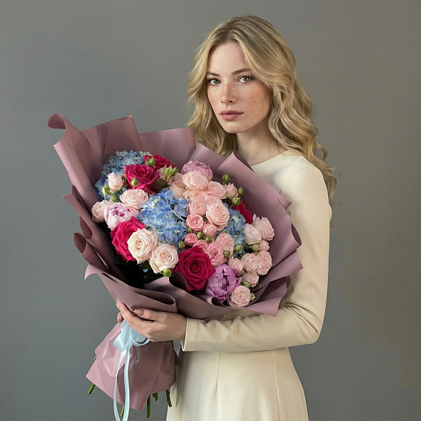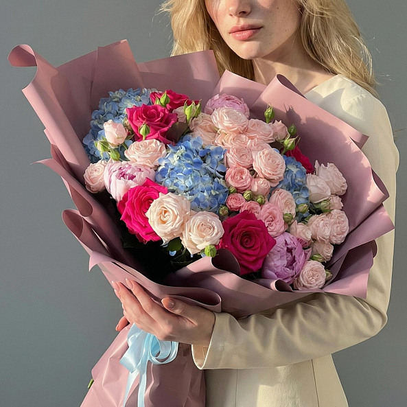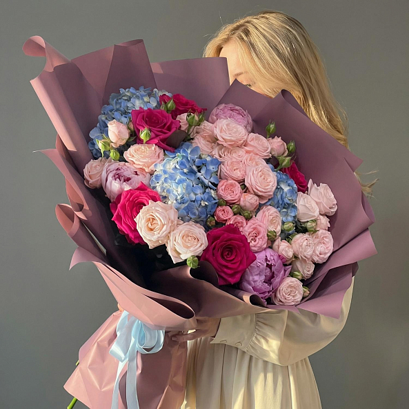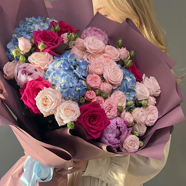 Букет Цветов. Гортензия Голубая, Пион "Сара Бернар", Кустовая Пионовидная Роза "Мисс Пиони", Роза Малиновая "Фулл Монти".