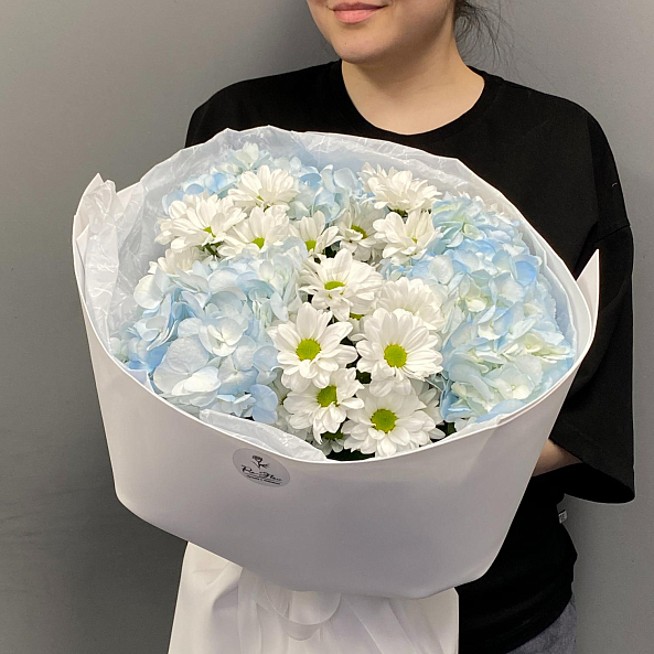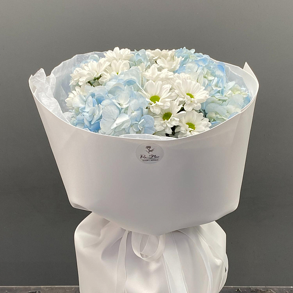 Этот изысканный букет "Нежная Симфония" сочетает в себе утончённость голубой гортензии и чистоту белой кустовой хризантемы. Гортензия, с её выразительными соцветиями, привносит в композицию объём и яркость, тогда как белые хризантемы добавляют свежести и лёгкости. Элегантное оформление подчеркивает гармонию этих цветов, создавая незабываемое впечатление. Этот букет станет великолепным подарком для любого случая, символизируя искренние чувства и заботу.