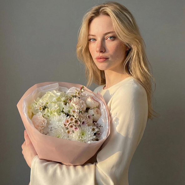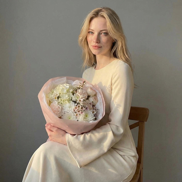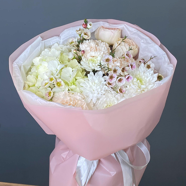 Этот изысканный букет — неплетение пионовидных роз, объемных гортензий, ароматной гвоздики, нежных хризантем и зелени хаммелациума, словно застывший волшебный рассвет в пастельных тонах. Каждый цветок, от пышных бутонов роз до воздушных соцветий гортензии, дарит ощущение тепла и уюта, а аккуратные ветки хаммелациума придают композиции свежесть и естественную гармонию. Упакованный в розовую кальку с атласной лентой «RN-Flow», букет выглядит лаконично и стильно, идеально дополняя как романтический образ, так и минималистичный интерьер.
