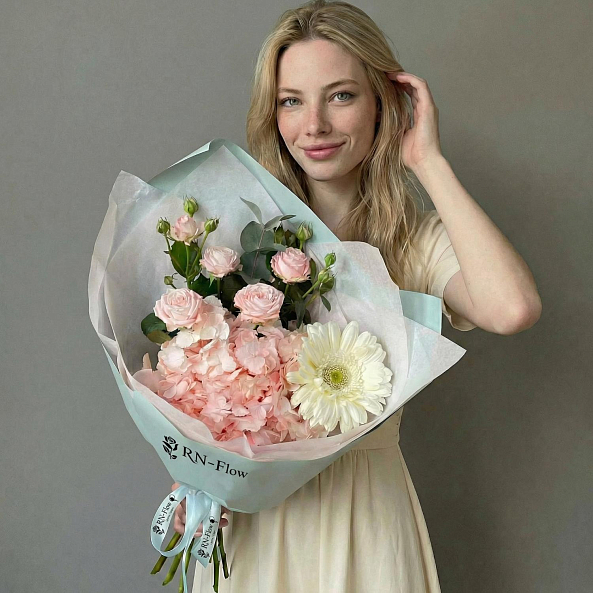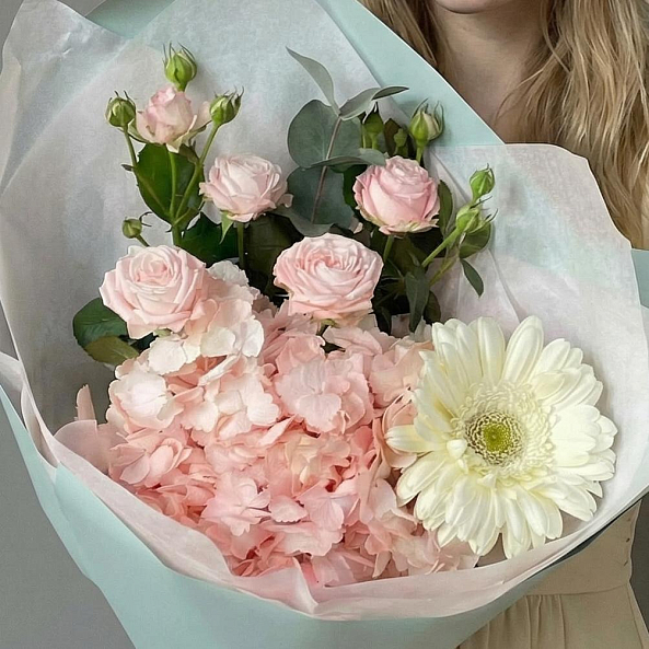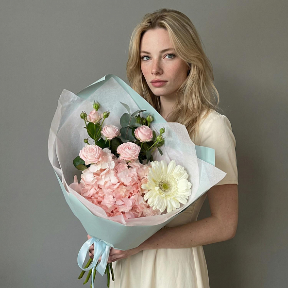 Гортензия, пионовидная роза «Мисс Пиони» и белая гербера — это не просто букет, а целая история. Идеален для тех, кто хочет подарить не просто цветы, а целое настроение.