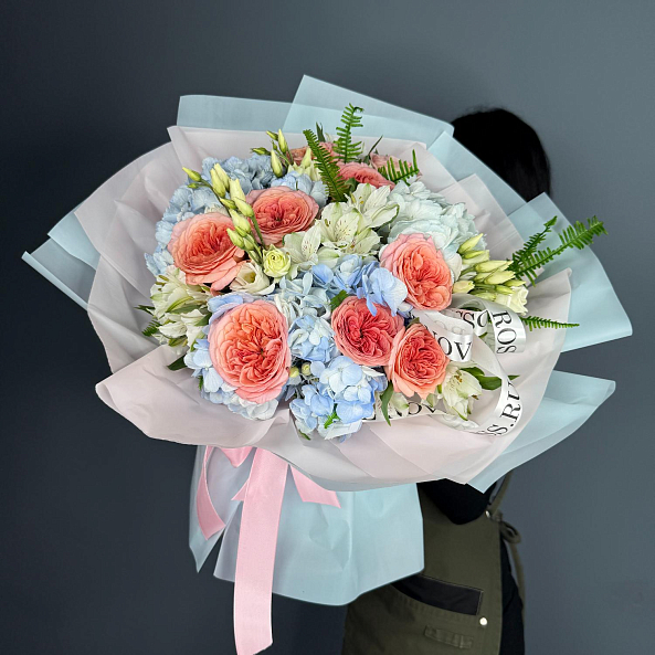 Элегантный и гармоничный букет, сочетающий в себе голубую гортензию, пионовидную розу "Лондон ай", белую альстромерию, белую эустому и сухоцвет папоротника. Каждый цветок добавляет свой уникальный шарм, создавая атмосферу утонченности и свежести. Этот букет идеально подходит для любых торжественных случаев и особенных моментов, подчеркивая ваше внимание и заботу.