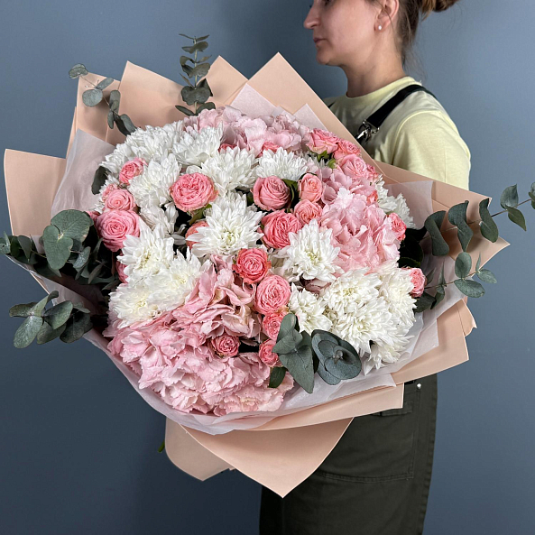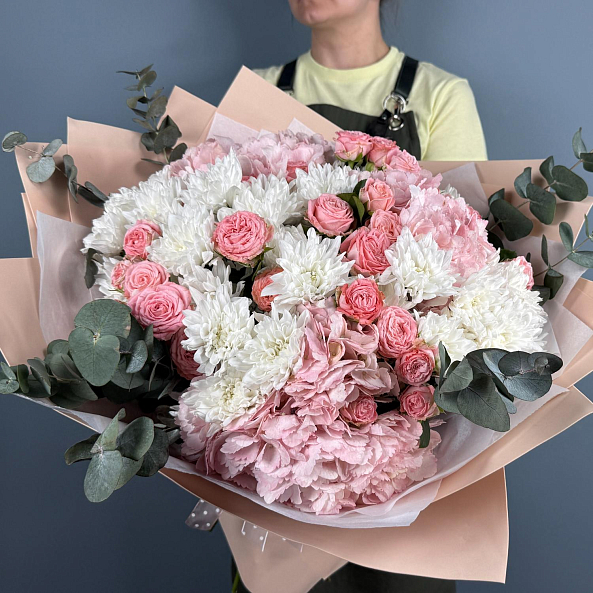 Букет цветов — розовая гортензия, кустовая пионовидная роза "Мадам Бомбастик" и кустовая хризантема "Алтай" — это сочетание пышности, нежности и изысканности. Гортензия придаёт композиции объём и свежесть, пионовидная роза добавляет романтику, а хризантема завершает букет мягкостью и теплом. Идеальный выбор для поздравления с праздником, юбилеем или как знак внимания.