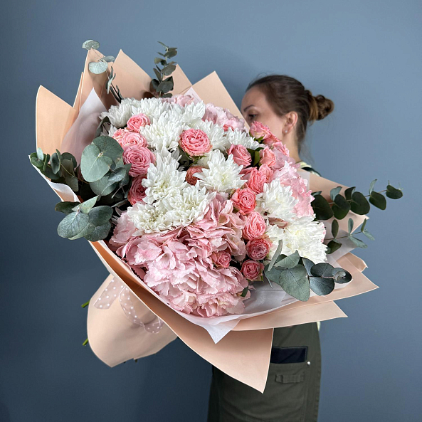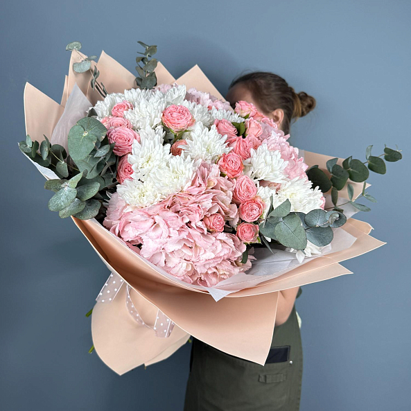 Букет цветов. Гортензия Розовая, Кустовая Пионовидная Роза "Мадам Бомбастик", Хризантема Кустовая "Алтай".