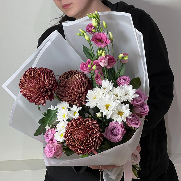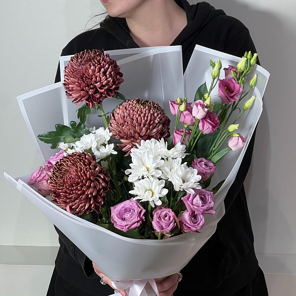 Элегантный и насыщенный букет в глубоких, но нежных тонах. Сочетает пышные коричневые хризантемы «Бигуди», изящную розовую эустому, белые кустовые хризантемы и роскошные фиолетово-розовые розы «Найтингейл». Композиция создает контраст текстур и оттенков — от плотных шаров хризантем до нежных лепестков роз и эустомы. Упакован в простую белую бумагу, что подчеркивает природную красоту цветов. Идеален для тех, кто ценит утонченность и необычную цветовую гамму.