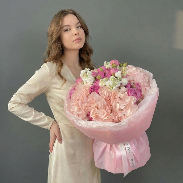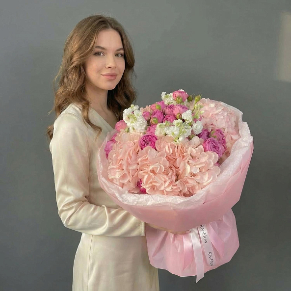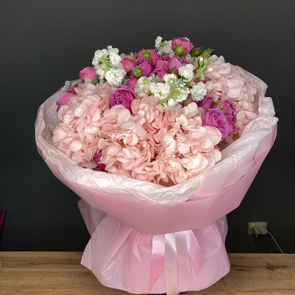 Этот изысканный букет — нежное переплетение кустовых пионовидных роз «Мисти Баблс», объемных гортензий и ароматной махровой маттиолы, словно застывший волшебный рассвет в пастельных тонах. Каждый цветок, от пышных бутонов роз до нежных соцветий маттиолы, дарит ощущение тепла и уюта, а аккуратные зеленые листья придают композиции естественную гармонию. Упакованный в розовую кальку с лентой «RN-Flow», букет выглядит лаконично и стильно, идеально дополняя как романтический образ, так и минималистичный интерьер.