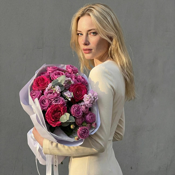 Букет Цветов. Кустовая Пионовидная Роза "Мисти Баблс", Роза Эквадор "Фулл Монти", Маттиола.