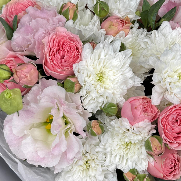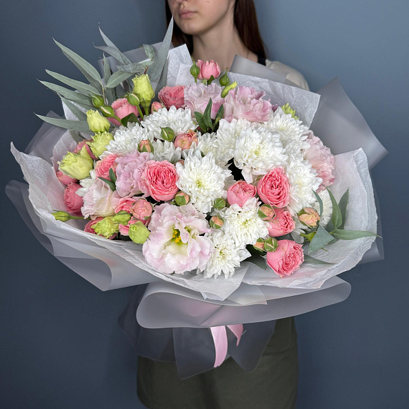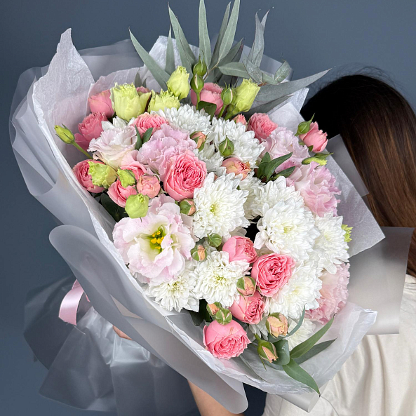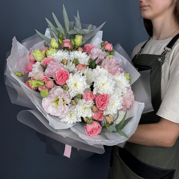 Пышный букет из кустовой пионовидной розы *«Спешл Дайменшн»*, белой хризантемы *«Алтай»* и розовой эустомы — гармония романтики и свежести. Эвкалипт придаёт композиции воздушность и аромат. Идеален для любого повода — от дня рождения до просто «спасибо».