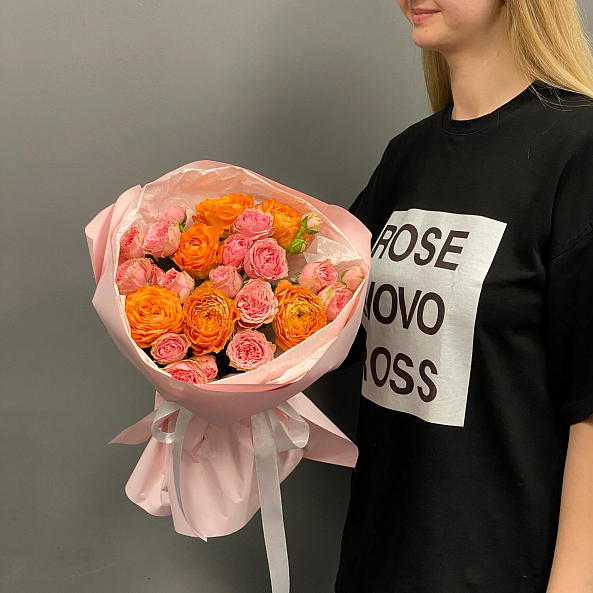 Яркий и жизнерадостный букет из розовых пионовидных  кустовых роз и оранжевых пионовидных роз. Сочное сочетание цветов в нежной розовой упаковке — идеальный выбор, чтобы подарить бодрость, тепло и хорошее настроение.