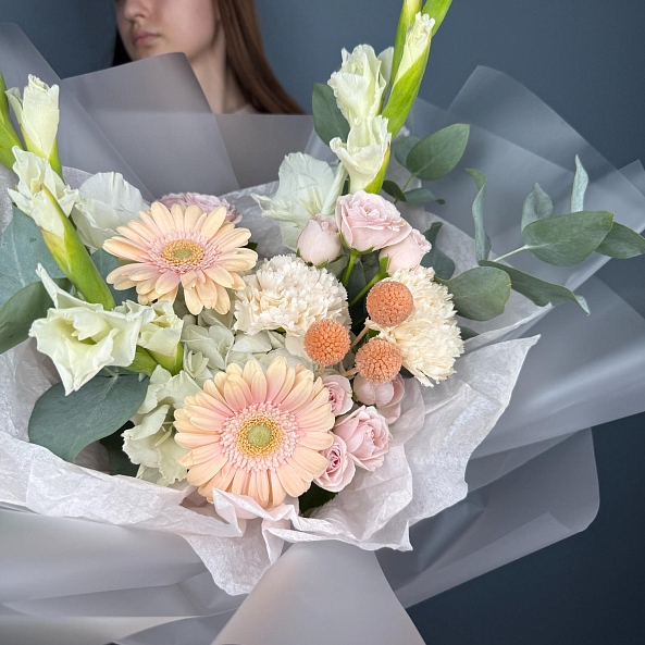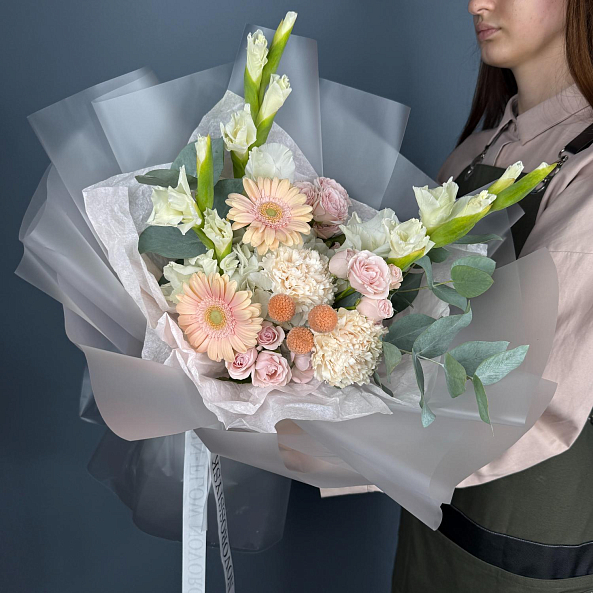 Элегантный и многослойный букет в нежной пастельной гамме. Композиция объединяет кустовую розу «Полина» с ее нежно-розовым оттенком, пышную белую гортензию, изящные белые гладиолусы, ароматную гвоздику, яркую герберу, текстурный сухоцвет «Краспедия» и свежие веточки эвкалипта цинерии. Все элементы собраны в объемную, воздушную форму, передающую ощущение уюта, спокойствия и утонченности. Упакован в матовую бумагу — идеальный выбор для тех, кто ценит безупречный вкус и гармонию.